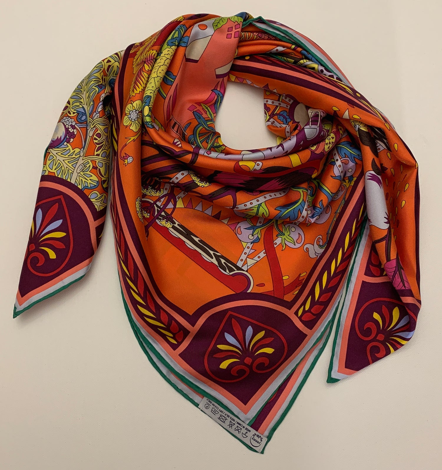 100% Silk Twill in 90 x 90 cm (dimensions can vary slightly because of the rolled hand-stitched edges).