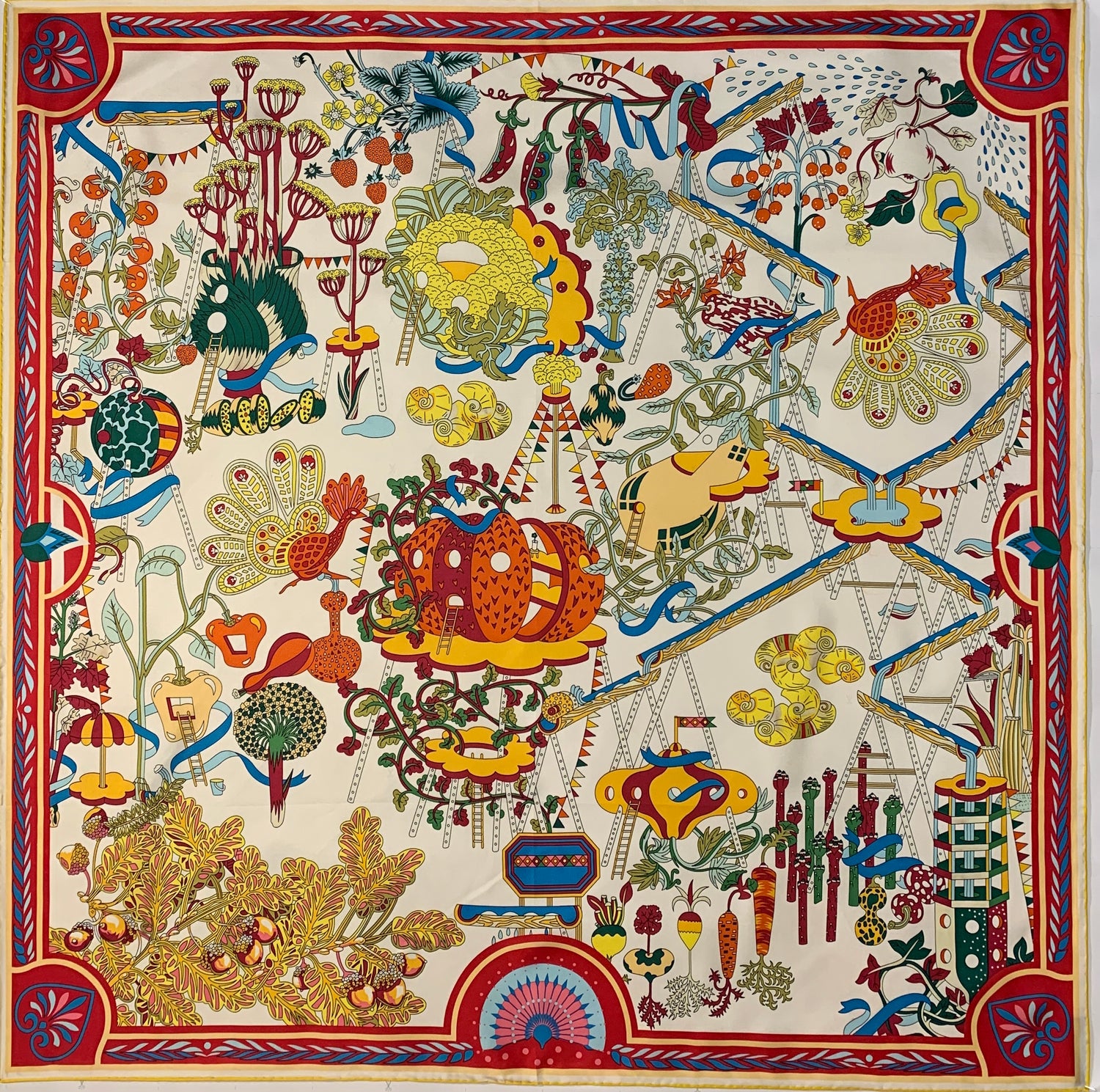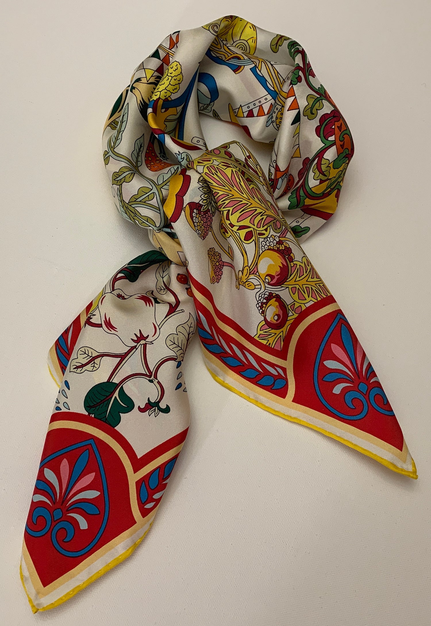 100% Silk Twill in 90 x 90 cm (dimensions can vary slightly because of the rolled hand-stitched edges).