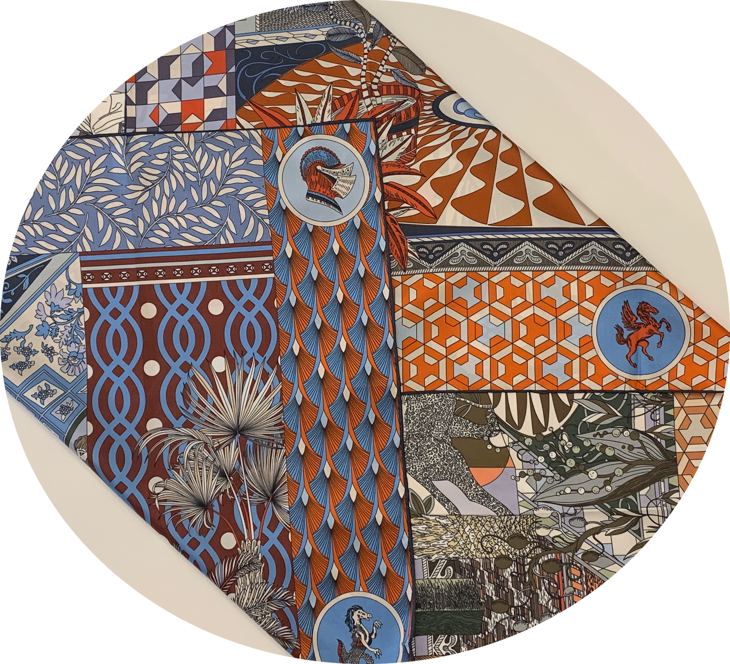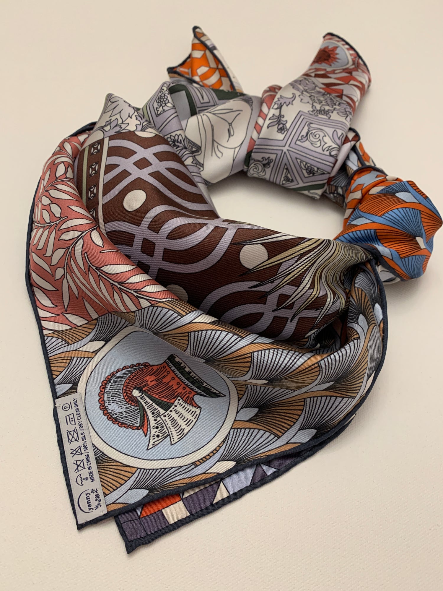 100% Silk Twill in 90 x 90 cm (dimensions can vary slightly because of the hand-stitched edges).